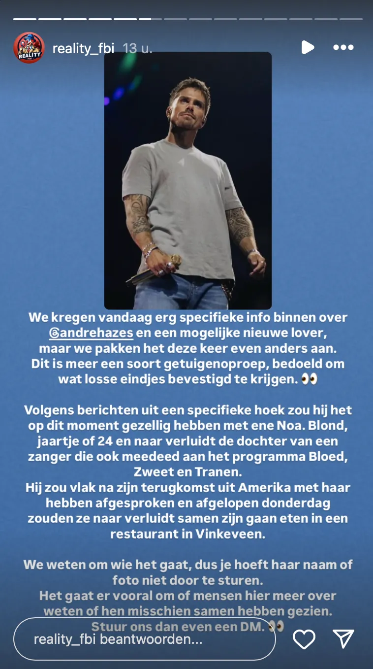 De 31-jarige zanger zou Monique, met wie hij een zoon heeft, ingeruild hebben voor de dochter van volkszanger Denny Braaf, bekend van het SBS6-programma Bloed, Zweet en Tranen. Volgens Reality FBI is André al langer met Noa aan het daten, mogelijk zelfs al sinds zijn terugkomst uit Amerika. “Hij zou vlak na zijn terugkomst uit Amerika met haar hebben afgesproken en afgelopen donderdag zouden ze naar verluidt samen zijn gaan eten in een restaurant in Vinkeveen”, meldt het kanaal.